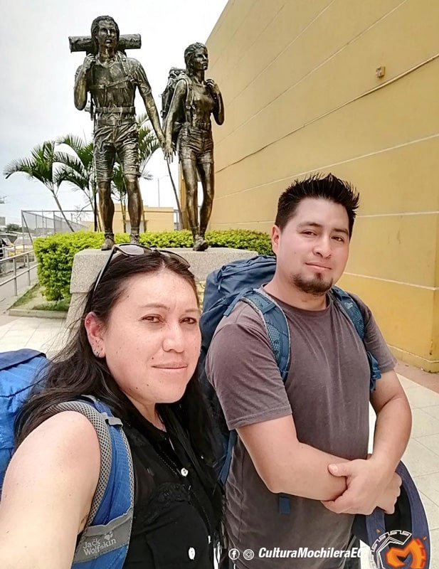 Posando en el monumento al mochilero